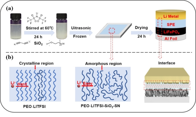 The preparation process of PEO 18 −LiTFSI−5 %SiO 2 −5 %SN composite electrolyte membrane and LiFePO 4 −Li system; b) The schematic diagrams of the microstructure, interface between electrolyte and electrode material and Li + transfer.
